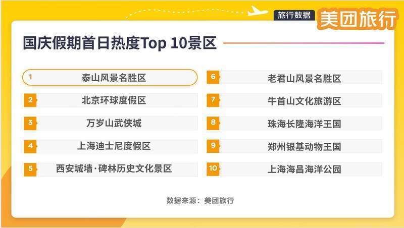 中国青年报客户端北京10月2日电(中青报·中青网记者 张均斌)今天,美团旅行发布相关数据显示,国庆首日多地景区门票售罄,出现“人从众”的热闹景象。热度Top10的景区分别为:泰山风景名胜区、北京环球度假区、万岁山武侠城、上海迪士尼度假区、西安城墙·碑林历史文化景区、老君山风景名胜区、牛首山文化旅游区、珠海长隆海洋王国、郑州银基动物王国、上海海昌海洋公园。
